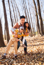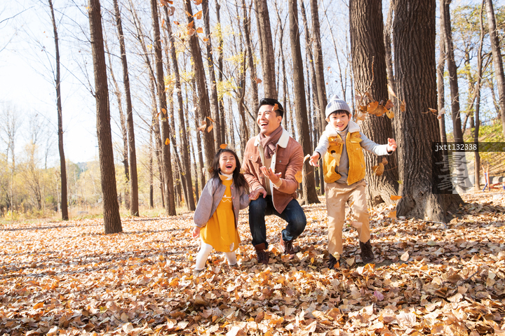 图片标题: 青年父亲带着孩子们在树林里玩耍