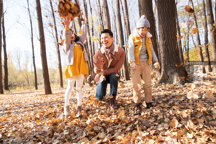 图片标题: 青年父亲带着孩子们在树林里玩耍