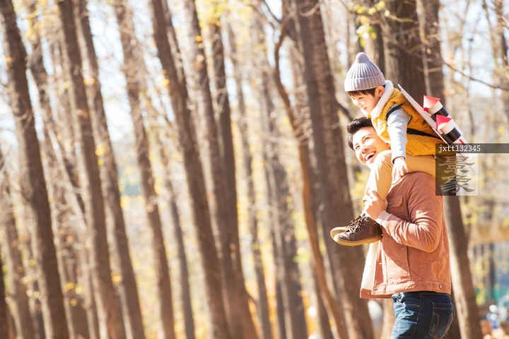 图片标题:     年轻父亲背着孩子玩飞机游戏