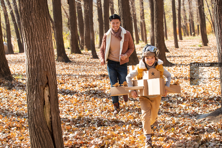 图片标题: 年轻父亲带着孩子玩飞机游戏