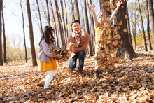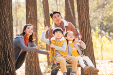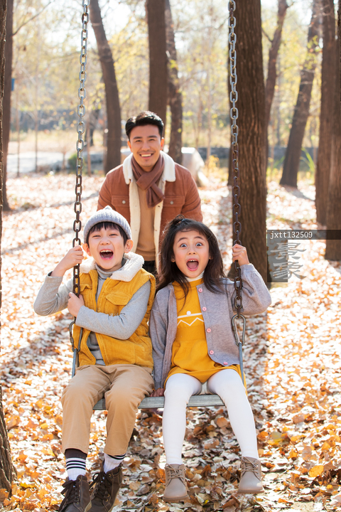 图片标题: 青年父亲推着孩子荡秋千