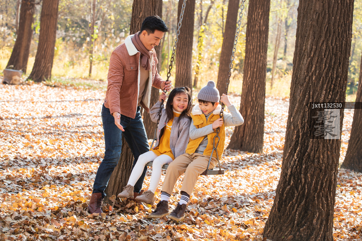 图片标题: 青年父亲推着孩子荡秋千