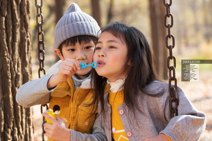 图片标题:     快乐儿童坐在秋千上吹泡泡