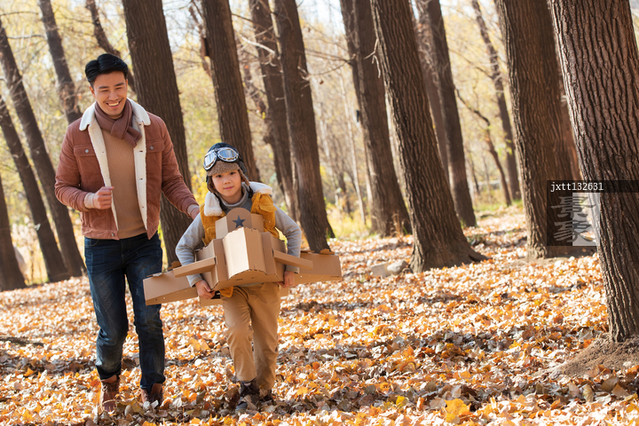 图片标题: 年轻父亲带着孩子玩飞机游戏