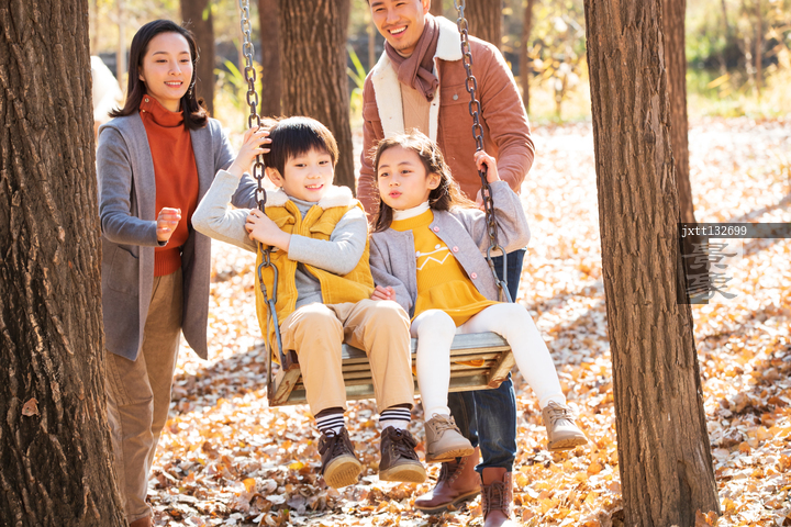 图片标题: 快乐家庭在户外荡秋千