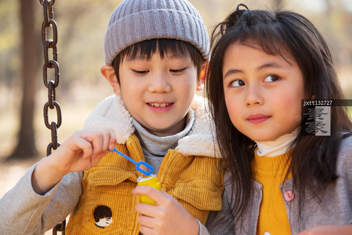 图片标题:     快乐儿童坐在秋千上吹泡泡