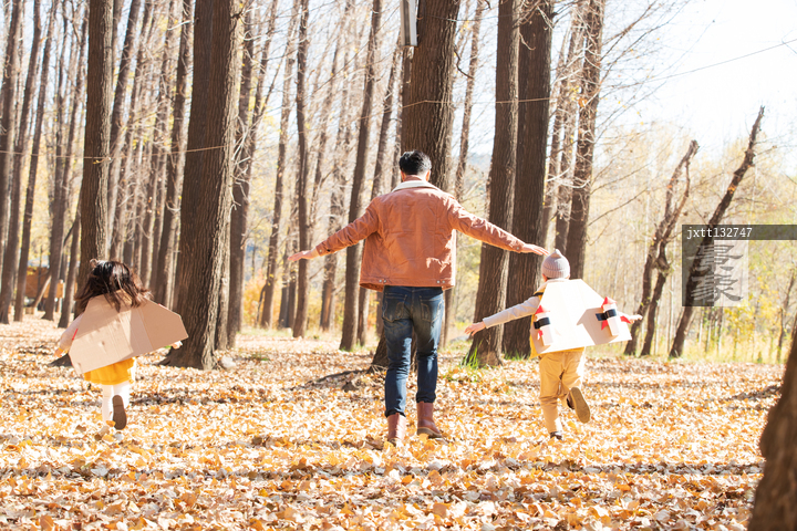 图片标题: 年轻父亲带着孩子们玩飞机游戏