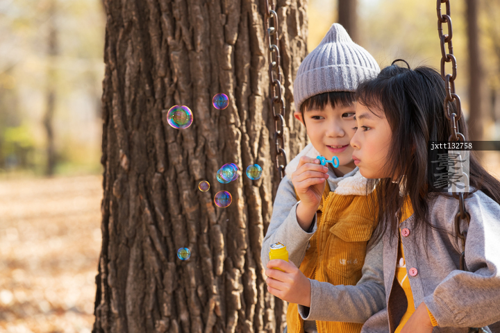图片标题: 快乐儿童坐在秋千上吹泡泡