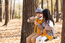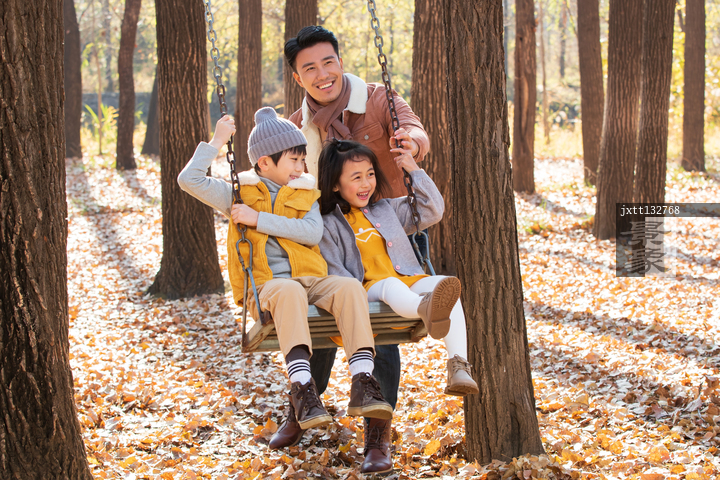 图片标题: 青年父亲推着孩子荡秋千