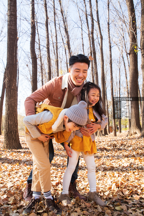 图片标题: 青年父亲带着孩子们在树林里玩耍