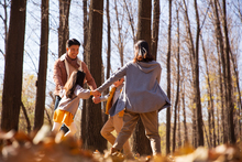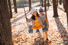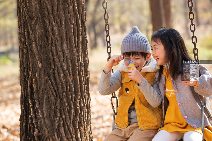 图片标题: 快乐儿童坐在秋千上吹泡泡