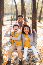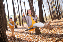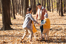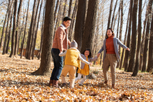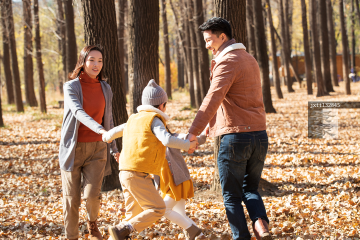 图片标题: 快乐家庭在树林里玩耍