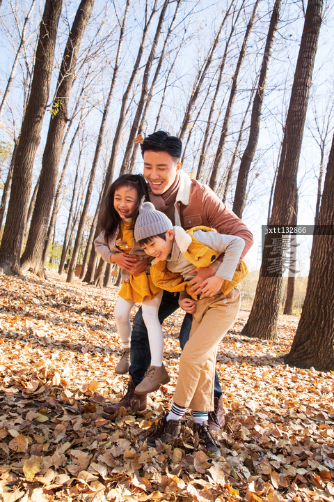 图片标题: 青年父亲带着孩子们在树林里玩耍