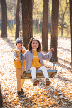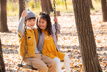 图片标题: 青年父亲推着孩子荡秋千
