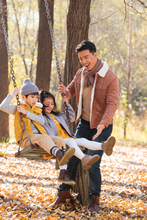 图片标题: 快乐儿童坐在秋千上吹泡泡