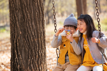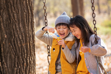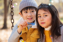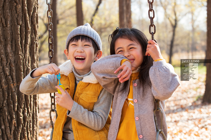 图片标题: 快乐儿童坐在秋千上吹泡泡