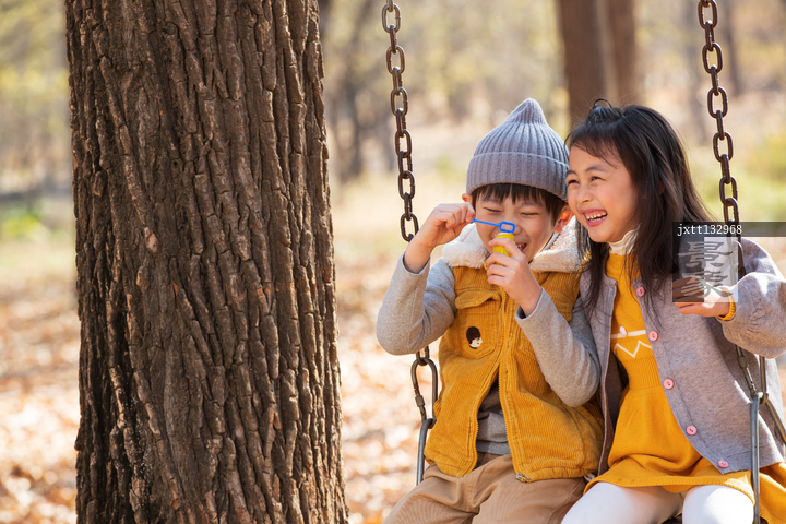 图片标题: 快乐儿童坐在秋千上吹泡泡