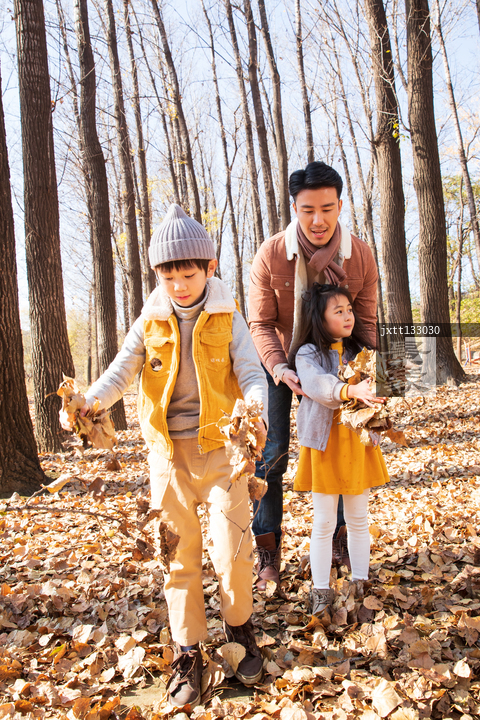 图片标题: 青年父亲带着孩子们在树林里玩耍