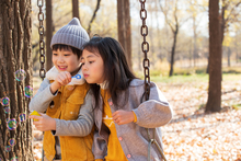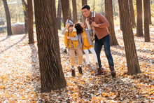 图片标题: 快乐家庭走在树林里