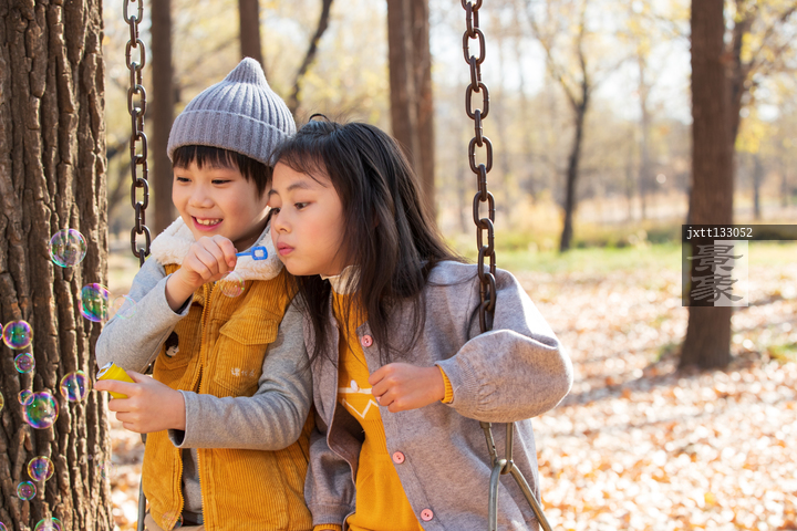 图片标题: 快乐儿童坐在秋千上吹泡泡