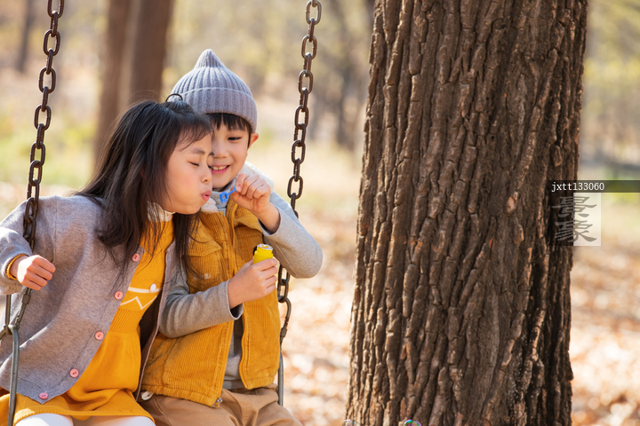 图片标题: 快乐儿童坐在秋千上吹泡泡