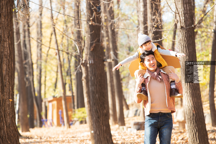 图片标题: 年轻父亲背着孩子玩飞机游戏