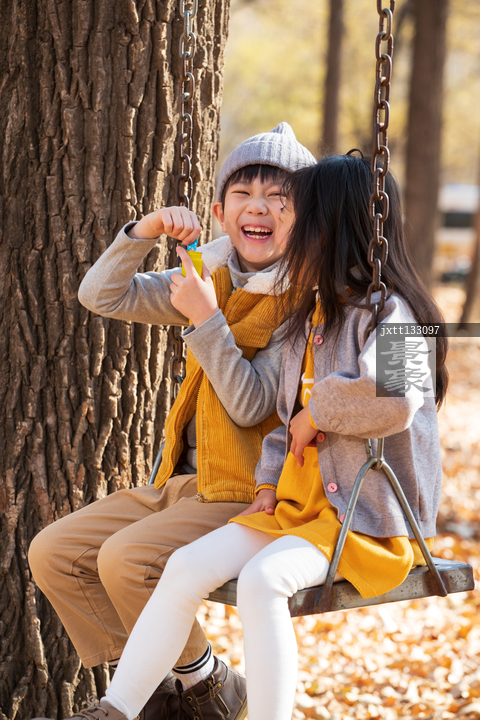 图片标题: 快乐儿童坐在秋千上吹泡泡