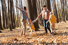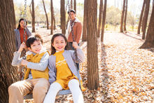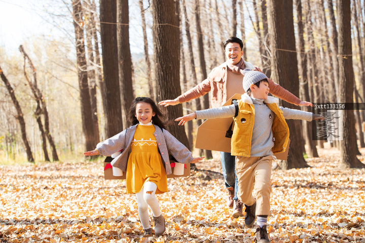 图片标题: 年轻父亲带着孩子们玩飞机游戏