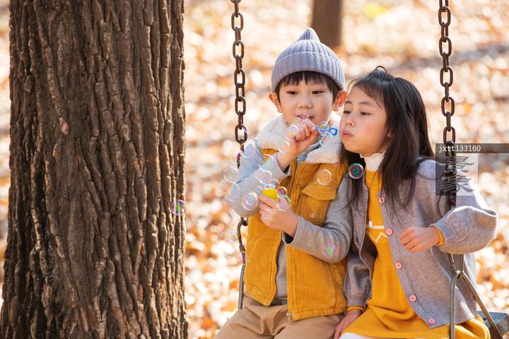 图片标题: 快乐儿童坐在秋千上吹泡泡