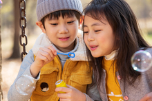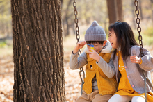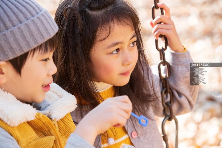 图片标题: 快乐儿童坐在秋千上吹泡泡