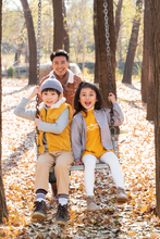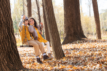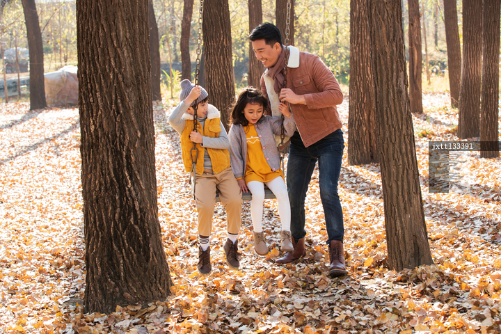 图片标题: 青年父亲推着孩子荡秋千