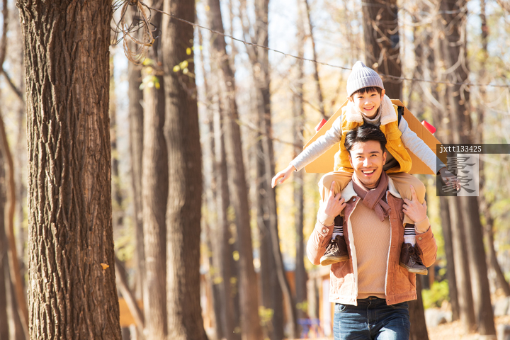 图片标题: 年轻父亲背着孩子玩飞机游戏