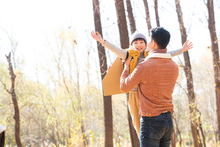 图片标题: 快乐儿童坐在秋千上吹泡泡