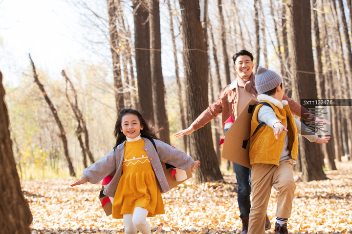 图片标题: 年轻父亲带着孩子们玩飞机游戏