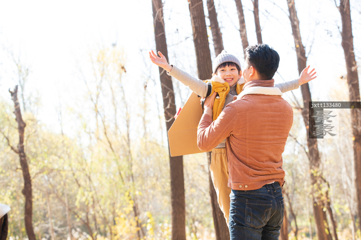图片标题: 年轻父亲抱着孩子玩飞机游戏