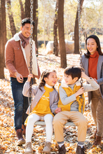 图片标题: 青年父亲带着孩子们在树林里玩耍
