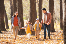图片标题: 青年父亲带着孩子们在树林里玩耍