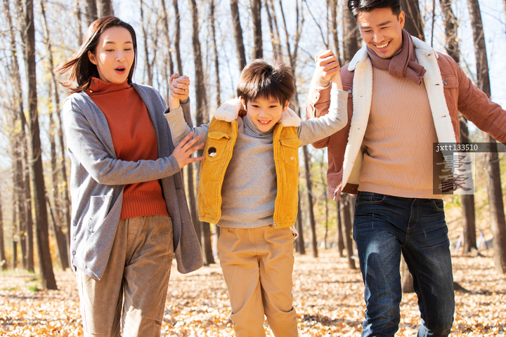 图片标题: 快乐家庭在树林里玩耍