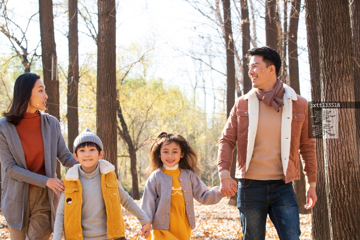 图片标题: 快乐家庭走在树林里