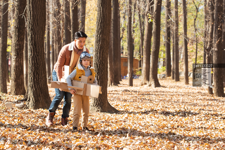 图片标题: 年轻父亲带着孩子玩飞机游戏