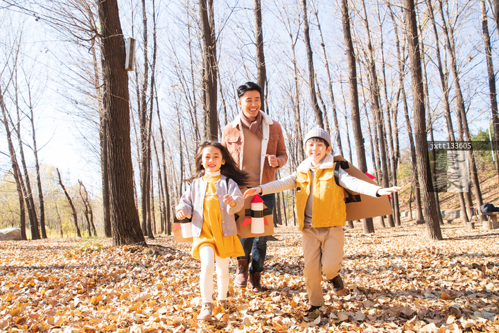 图片标题: 年轻父亲带着孩子们玩飞机游戏
