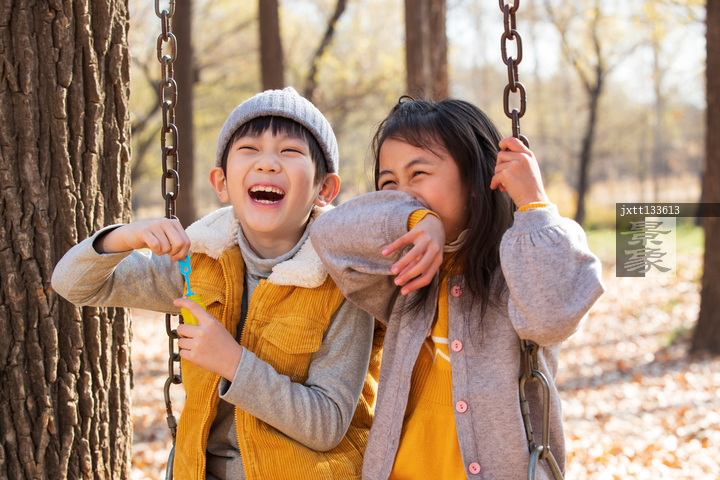图片标题:     快乐儿童坐在秋千上吹泡泡