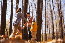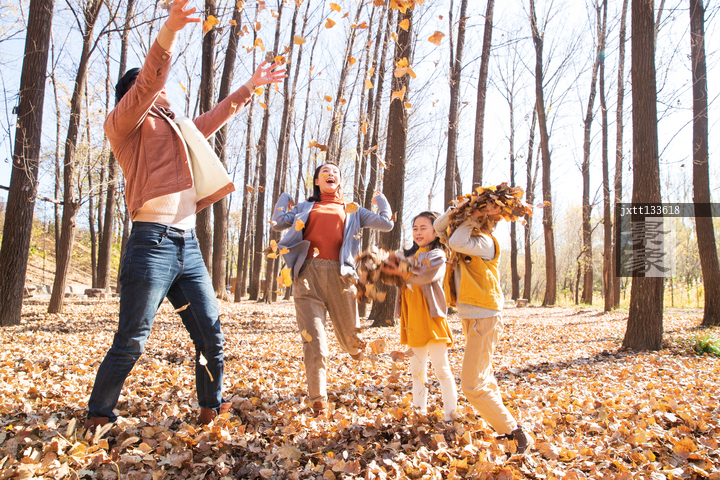 图片标题: 快乐家庭在树林里玩耍