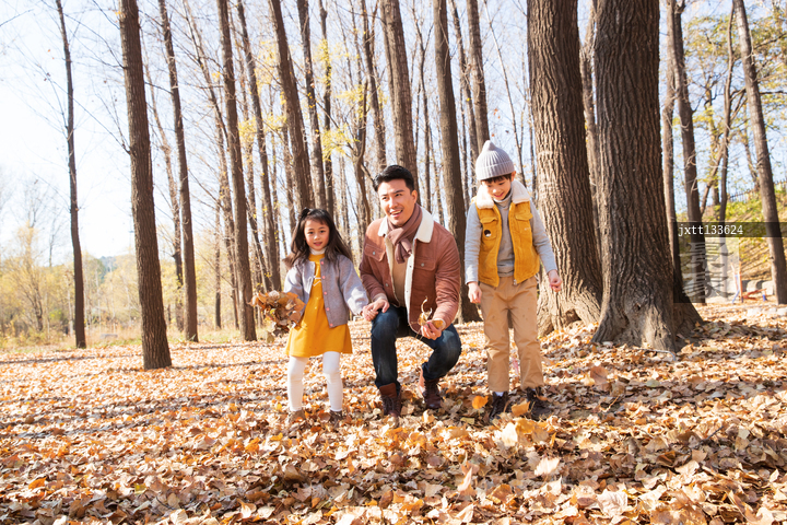 图片标题: 青年父亲带着孩子们在树林里玩耍
