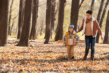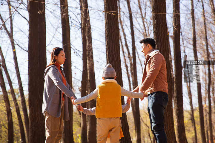 图片标题: 快乐家庭在树林里玩耍