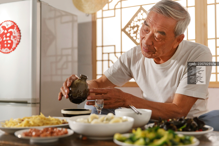 图片标题: 老年人坐在家里吃饭喝酒