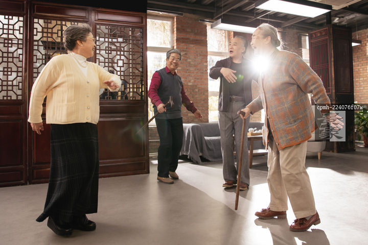 图片标题: 快乐的老年人聚在一起唱歌跳舞