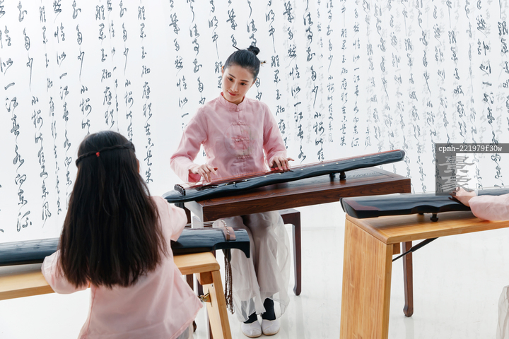 图片标题: 青年老师教小学生学古筝