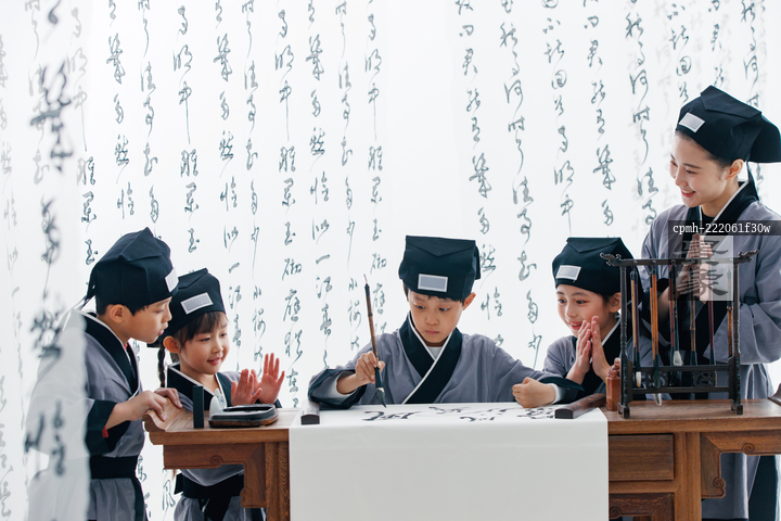 图片标题: 国学老师教小学生学书法