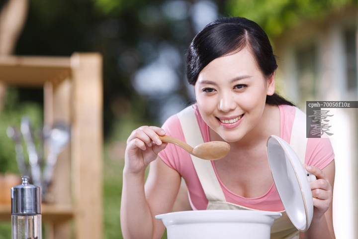 图片标题: 东方女人在户外厨房烹调